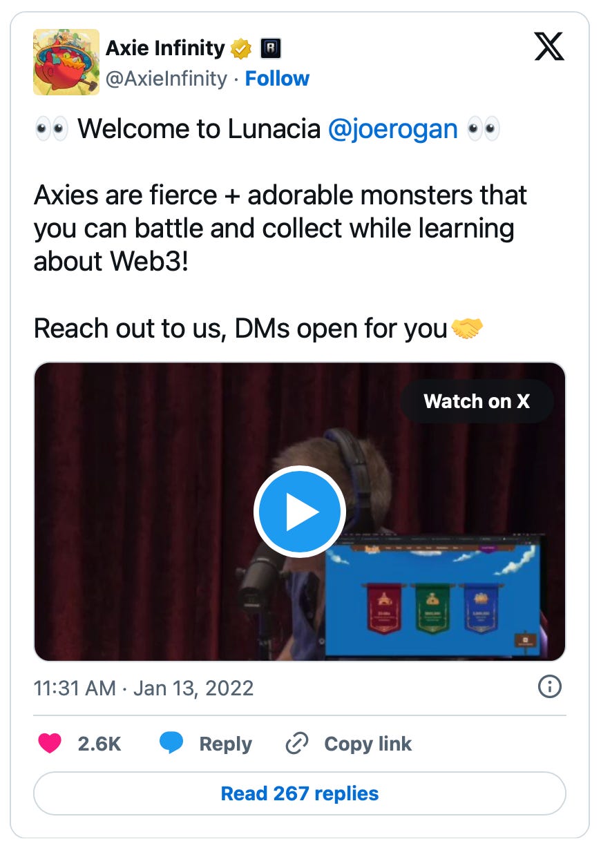 This isn’t the first time Axie and Ronin have pierced the crypto bubble: In 2022, Axie Infinity made an appearance on The Joe Rogan Experience podcast. A few months later, Axie set a Guinness World Record for #1 NFT collection by all-time volume. Web3 gaming and collecting remain the most accessible way to introduce crypto to new recruits.