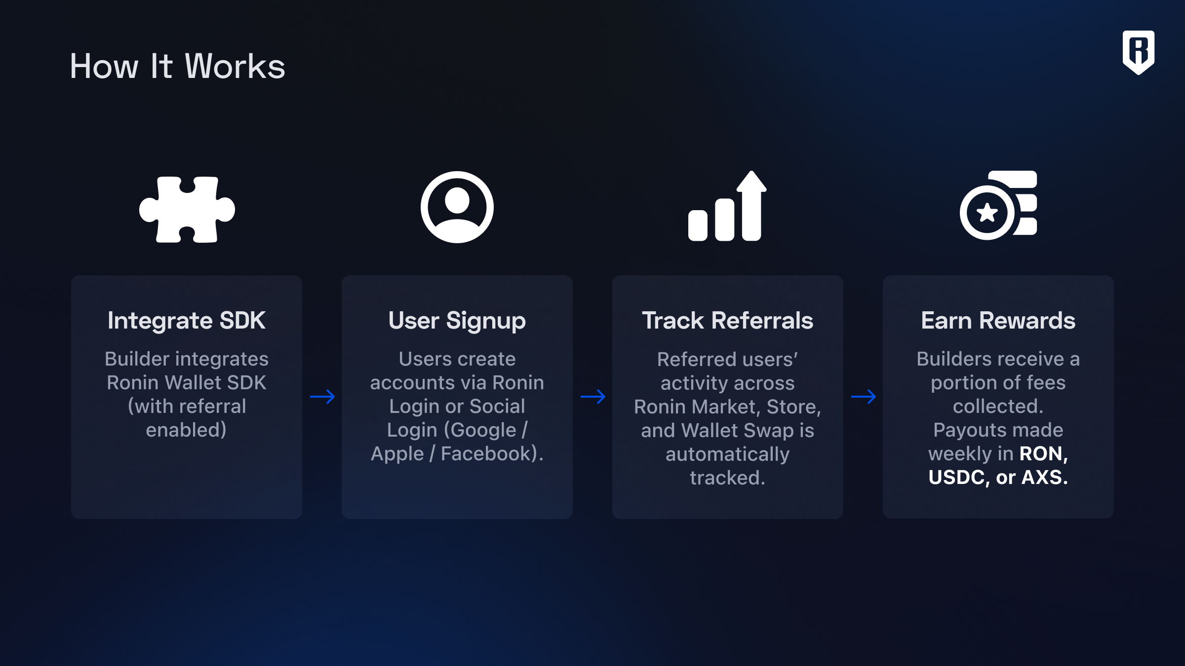 Builders receive an automatic payout every week. The amount is based on a simple calculation: Total revenue generated x Your revenue share percentage. The currency is based on your users’ onchain activity. For example, revenue generated in RON means payouts are paid in RON. Revenue generated in AXS means payouts are paid in AXS. The same goes for USDC. The more users you refer, the higher your revenue share percentage can be.