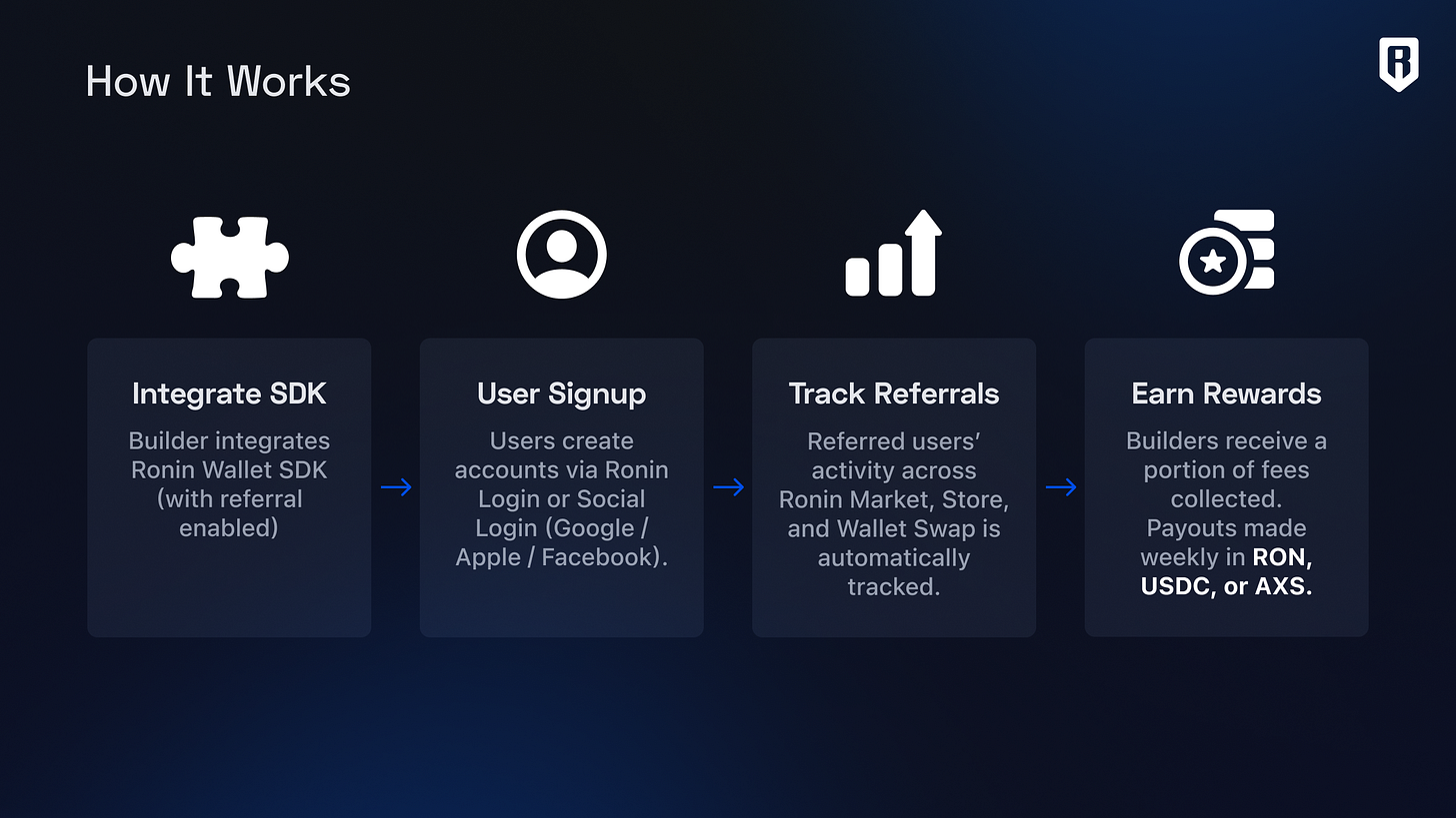 Introducing the Builder Revenue Share Program: Earn a portion of the revenue generated by YOUR community and get weekly payouts in RON, AXS, and USDC that scale as you grow. This opt-in program empowers third-party builders who integrate Ronin Wallet SDK to boost their revenue.