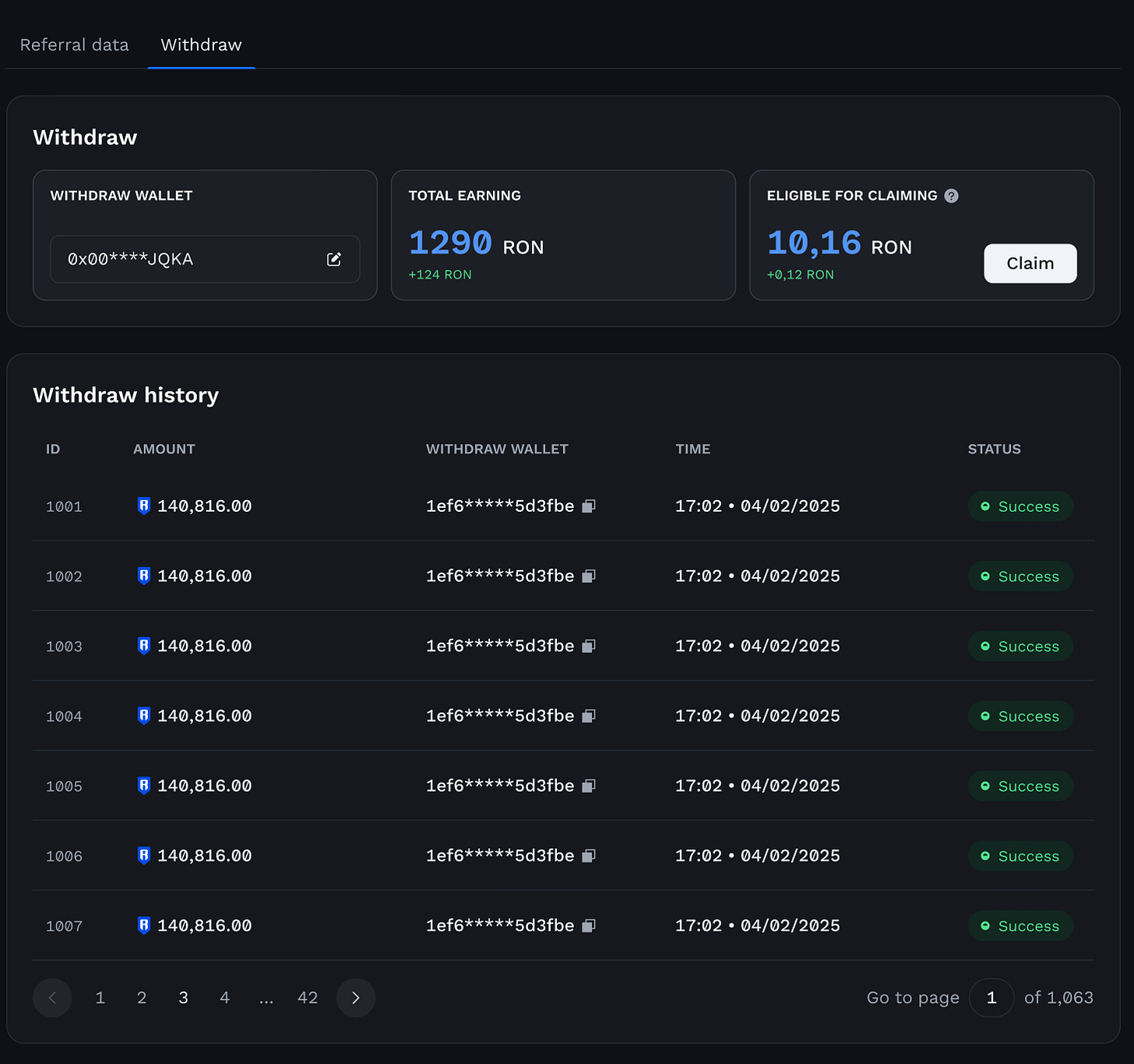 Track earnings and payouts in the Ronin Developer Console: See total referrals, active referred wallets, traded volume per user, and more. Receive weekly payouts in RON, AXS, and USDC that scale as you grow.