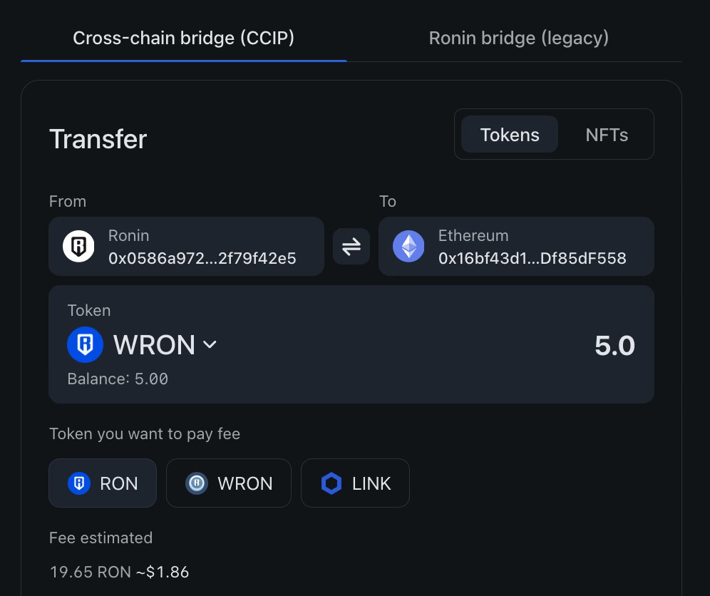 Swap RON on Ronin → wRON on Ethereum