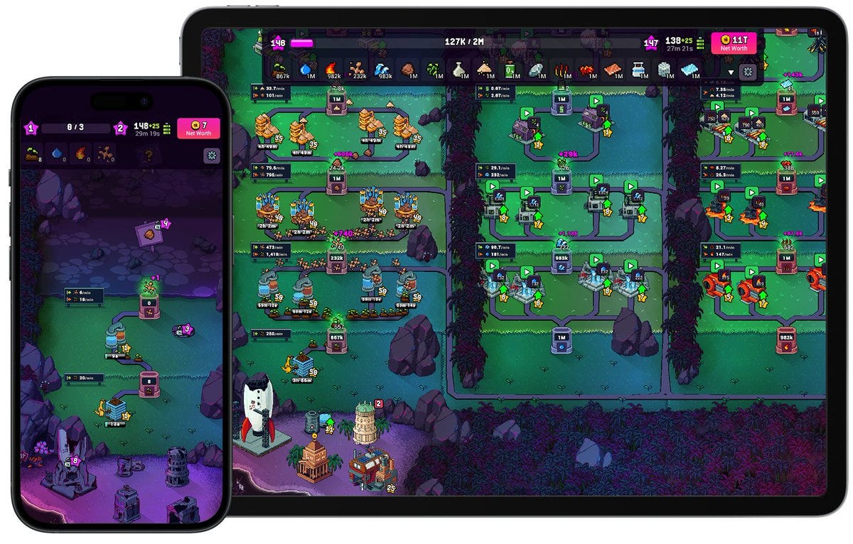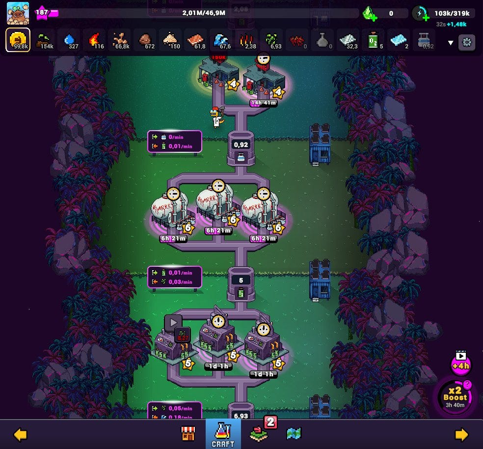 As you progress, you’ll gradually unlock new features, materials, and industries. Mud can be crafted into Clay. Clay into Sand. Sand into Copper. And so on, until you’re running a growing network of factories that you’ll need to upgrade in order to optimize production.