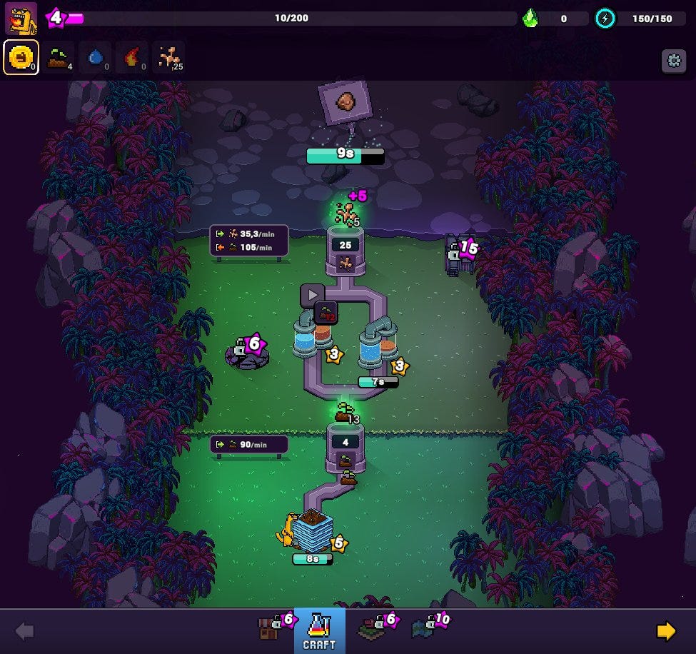 At the time of writing, Craft World features 29 different materials, crafted across four distinct land plots: one Earth plot, one Water plot, one Fire plot, and one flexible plot. This flexible plot is especially important, as it allows you to research new materials and boost efficiency by adding extra factories.