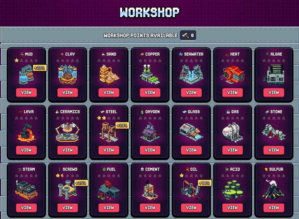 The Workshop generates Workshop Points as it levels up. These points can be permanently assigned to specific industries to increase their production speed. Because they cannot be reassigned, choosing where to allocate them requires careful thought.