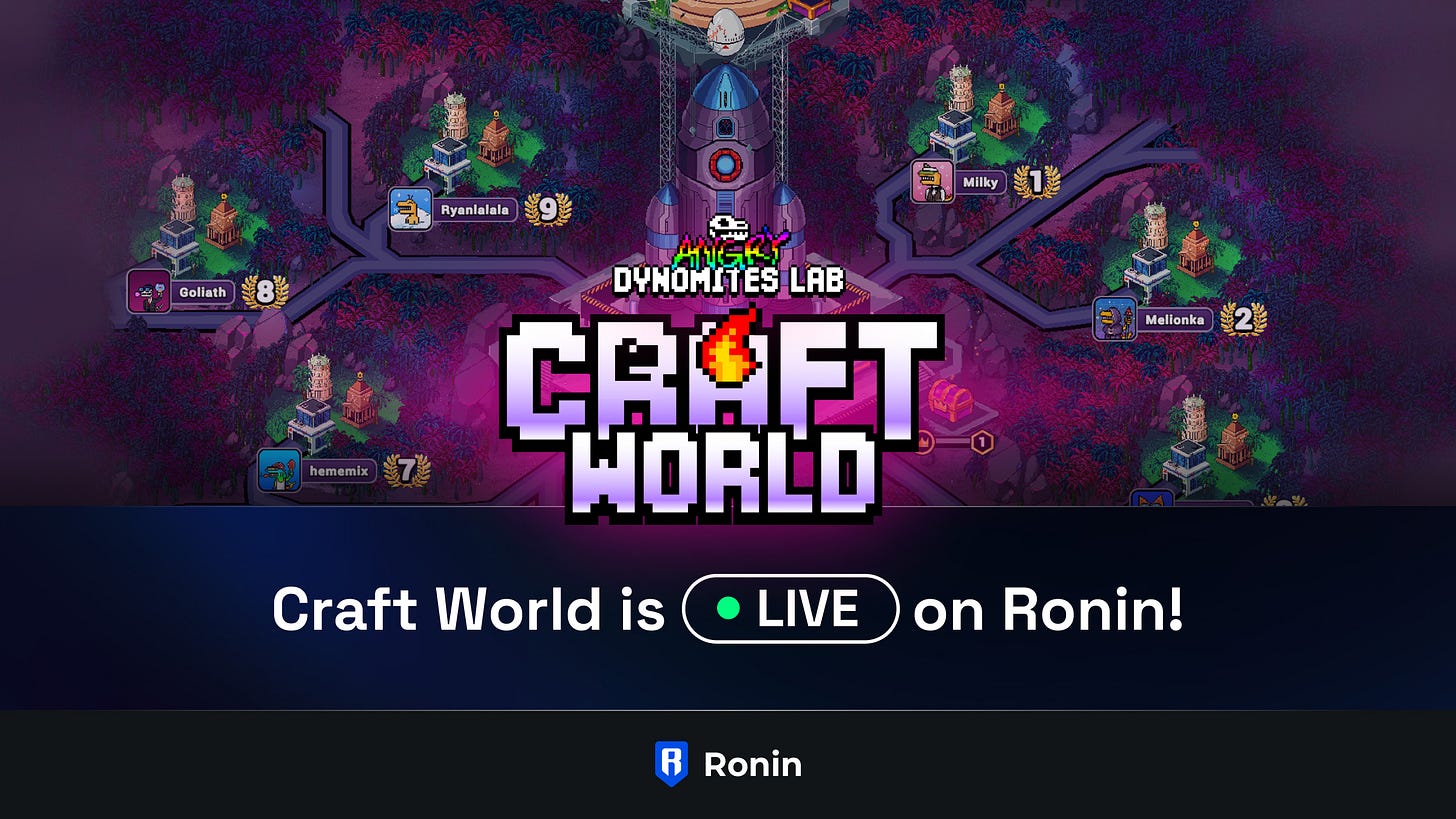 Craft World is LIVE on Ronin mainnet! Jump into the multiplayer, free-to-play resource management game from Dynomites Lab here. Build masterpieces and farm resources. Trade in-game items for onchain DynoCoins. Discover new areas, earn rewards, and more!