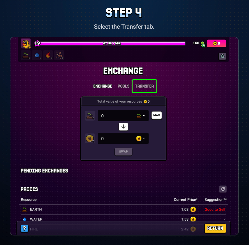 Want to transfer your onchain DynoCoin into the game? Unlock the Exchange Build at Level 12, then click “Transfer.” Select Wallet —> Game and complete the flow.