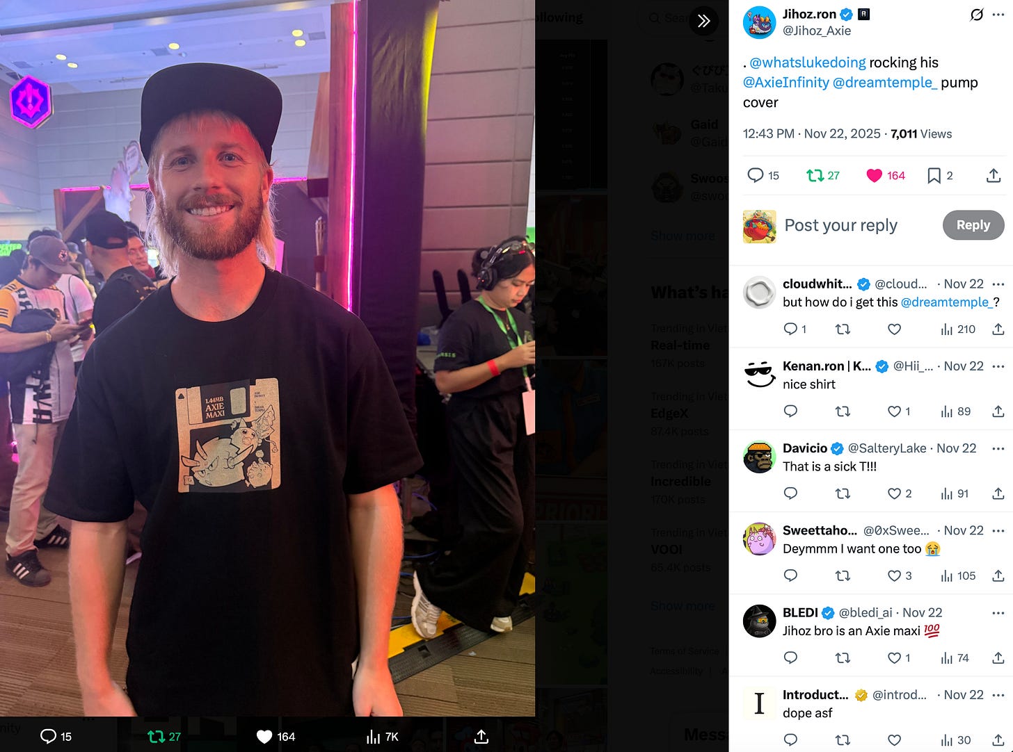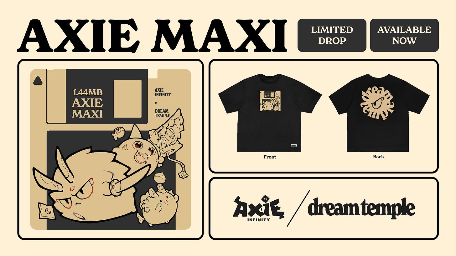 Purchase an Axie Maxi tee with RON, cash, or USDC at dreamtemple.xyz. Each limited-edition tee costs $50 USD, and shipping will begin one week after you place your order. The entire purchase process will take place on Dream Temple’s website.