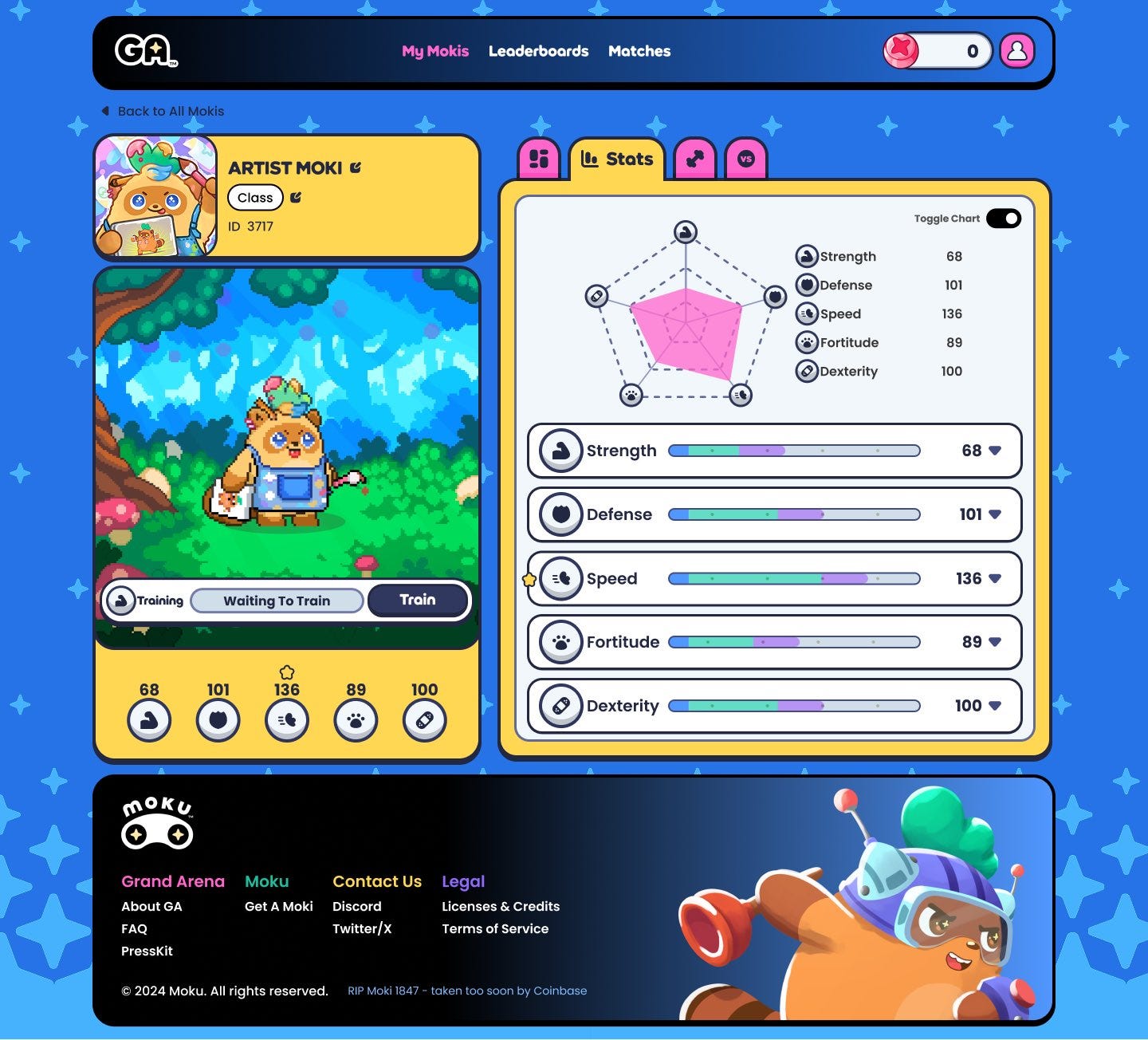 This is where you train and level-up your Mokis. Remember: Moki Mayhem features auto-battles, so the only way to get an edge over other players is via training. Every Moki has five stats that influence performance in Moki Mayhem: