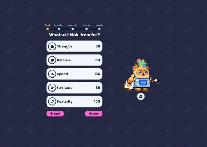 Inside Moki Manager, you can select which stat to train, the training duration, and intensity of each session. Pro-tip: Snacks speed up the process. Your Mokis will also continue to auto-battle while training, making it possible to see whether the training is working. This can help you fine-tune your strategy over time.