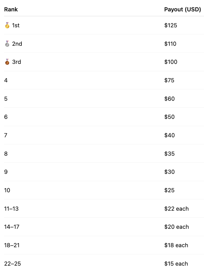 Submit as many videos as you want using this form. Twenty-five entries will take home $60 USDC every two weeks – and yes, you can win multiple times! That means a single creator can make three videos and win three prizes of $60 for a total of $180 USDC in rewards.