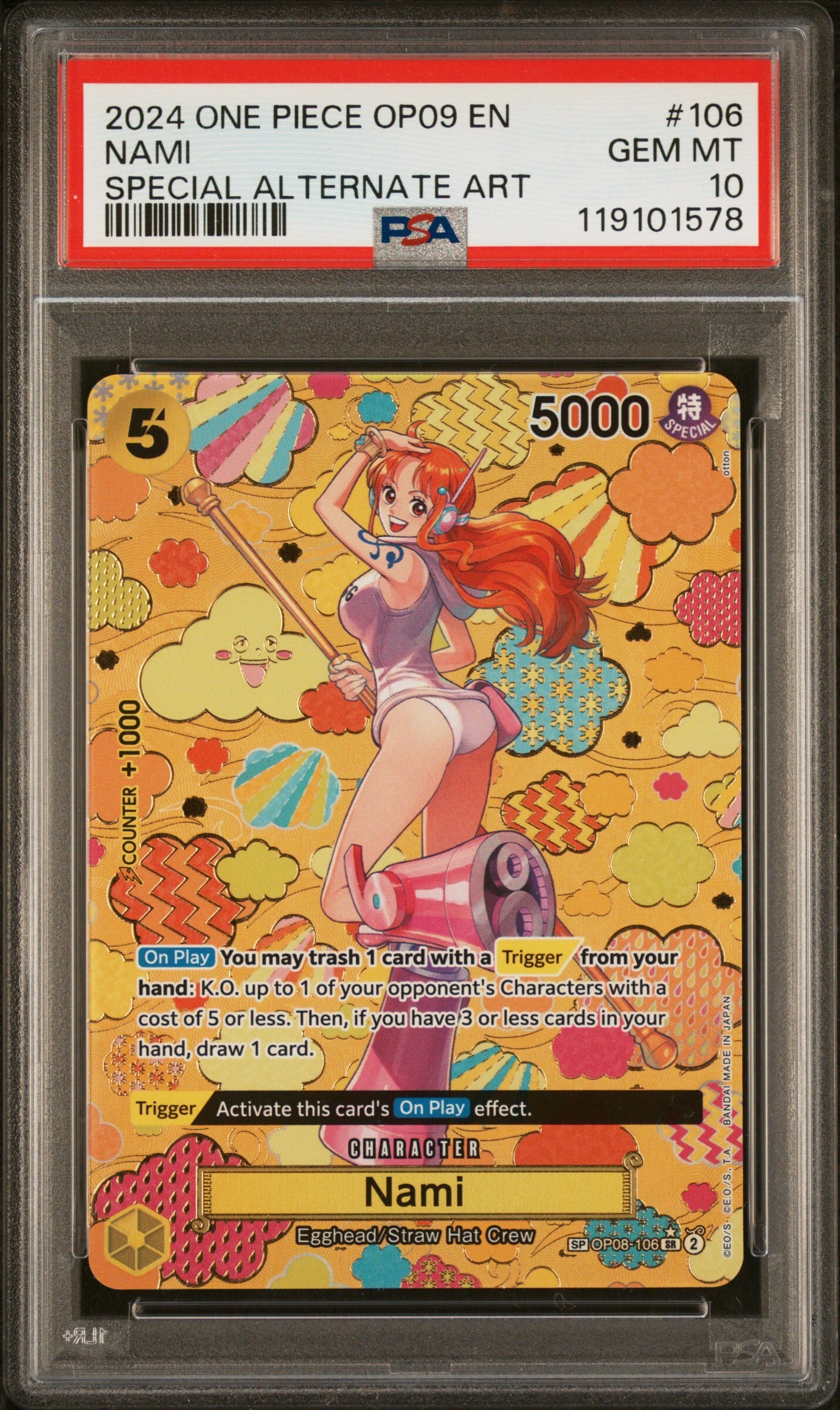 This machine features curated Pokemon and One Piece TCG cards. It costs $2.40 USDC to spin. Spin for a chance to win the ultra-rare The Grail: OP09-EMPERORS IN THE NEW WORLD NAMI!