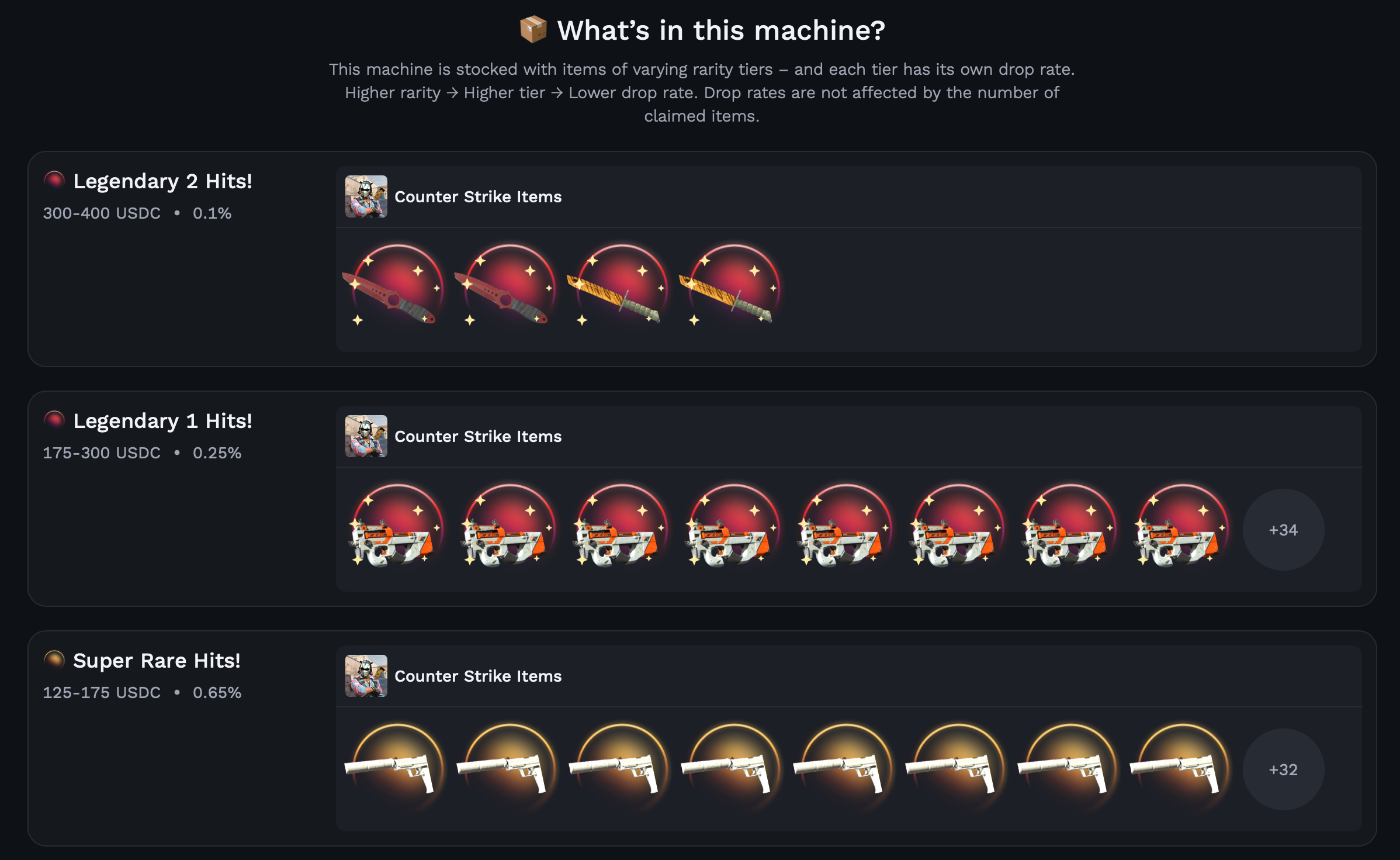 Introducing the CS2 Skin Machine: Take home rare items including a Crimson web skeleton knife, Tiger tooth bayonet, p90 Asiimov, USP-S Whiteout, and more. Each spin costs $10 USDC or $10 in RON.