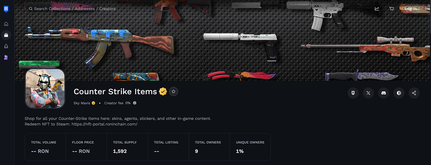 The Counter-Strike Item NFT collection is LIVE on Ronin! Trade CS2 items onchain, deposit them to your Steam account, and win them in the new Fortune Spin machine. This NFT collection has a 2.5% royalty fee that we’ve waived for the next month! CS2 NFTs trade in RON and USDC only.