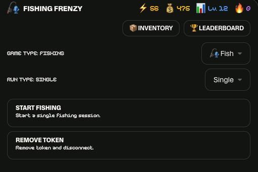 Note: Remember to log in the same way you do for Fishing Frenzy to use your existing account; otherwise, a new Fishing Frenzy account will be created for your agent. To connect to a different account, you will also need to first “remove token” then clear your Fishing Frenzy and Privy cache/cookies.