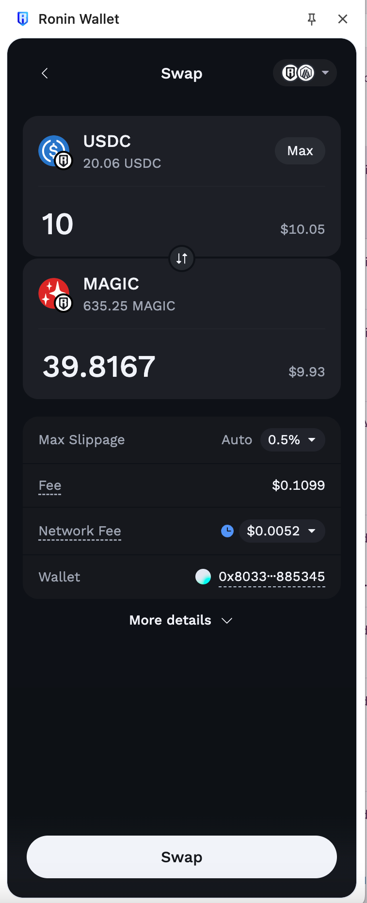 There are three ways to get $MAGIC on Ronin: swapping on Katana here, using the new cross-chain swap feature in your Ronin Wallet browser extension, and bridging $MAGIC using the Treasure bridge. Here’s how to make a cross-chain swap: