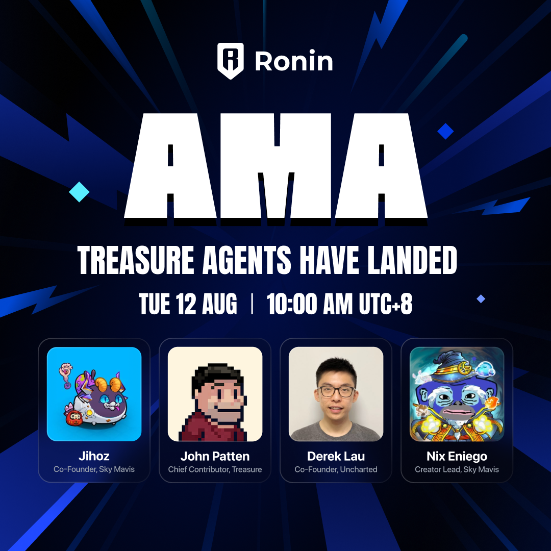 Ronin’s ecosystem is opening up beyond gaming. AI agents. A $300K Innovation Grant for new apps. DeFi protocols coming online. Wondering what today’s alliance means for our mission? Join founders John Patten from Treasure, Jihoz from Sky Mavis, and Derek Lau from Uncharted for an AMA on Tuesday, 12th @ 10:00 UTC+8 to learn more.